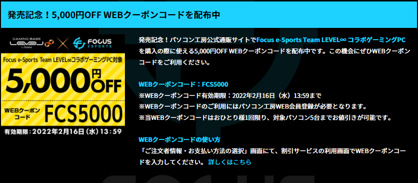 パソコン工房のコラボ商品に関しての一番の特徴としては、コラボ商品の全てに使用する事が出来る5,000円割引クーポンが貰える事です。今回のコラボのクーポンはこちら!