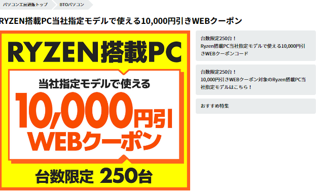 台数限定250台!Ryzen搭載PC当社指定モデルで使える10,000円引きWEBクーポンコード